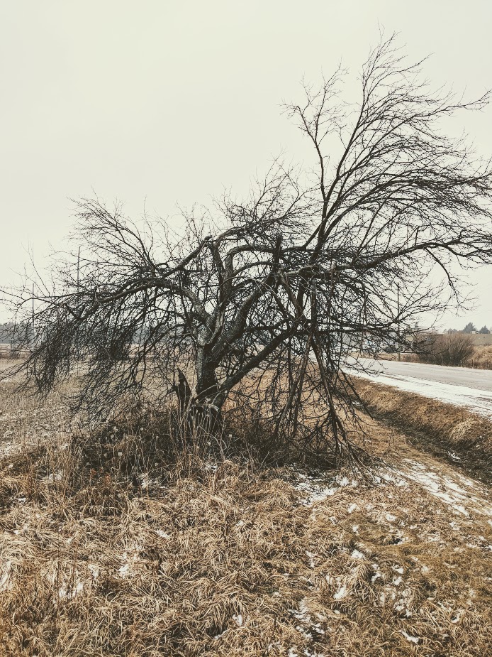 I had stopped along a country road to take a photo of an interesting tree, standing by itself.  I had to navigate a shallow ditch to get into proper position.  As I was doing so, a Police Officer pulled up behind my car.  My first thoughts were Oh oh.  Am I trespassing? Perhaps she thinks I am peeing in public?  Or maybe doing an illegal drop off?