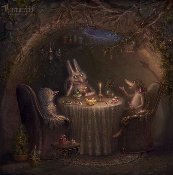 Possum was wondering what he should do about the hole in his roof. He sat and wondered a very long time. Then he decided to have an Unbirthday party. He invited his only two friends Hedgehog and Chick. Yes (he thought) I will break out my last bottle of celery root wine and we’ll all drink a toast! Well. When Hogg and Chick got there, he decided to drink the wine himself. After all, it was a very small bottle and it was, after all, his last one. Hogg even pointed out that they had brought him Unbirthday gifts, and “I had to bring my very kid, my kid. No babysitter tonight.” But Possum just farted, scratched his head, and took to thinking about that hole again.