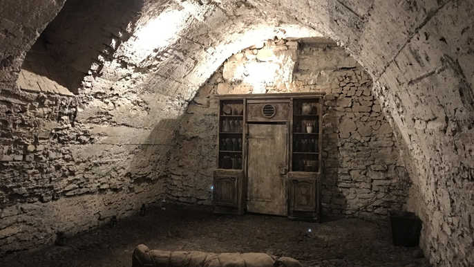 It winds a bit, and at its end there is something with a faint bluish glow.
