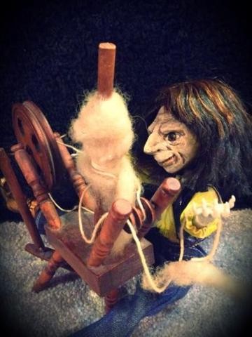 There sits a small creature, sitting on a stool beside a spinning wheel.